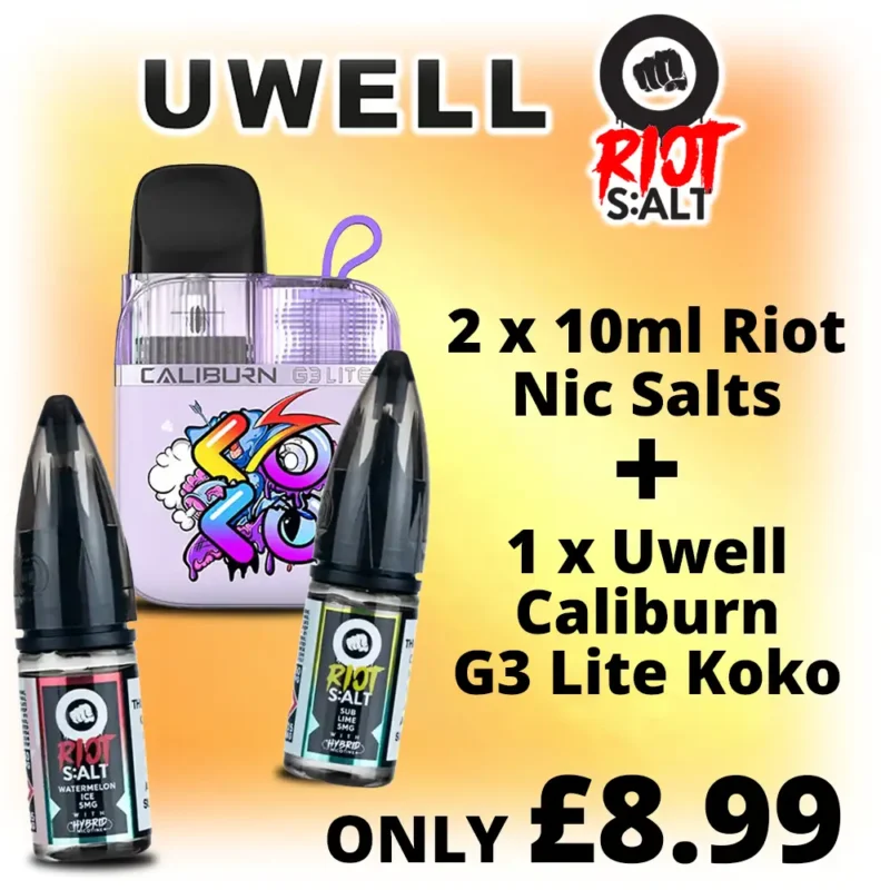 This vape bundle is designed for simplicity, performance, and strong flavour. It includes 1 x Uwell Caliburn G3 Lite Koko Pod Kit and 2 x Riot Squad 10ml Nic Salts, giving you a complete refillable vape setup in one package. With a combined RRP of £26.97 and a bundle price of just £8.99, you save £17.98, making this a great-value option for beginners and everyday users.